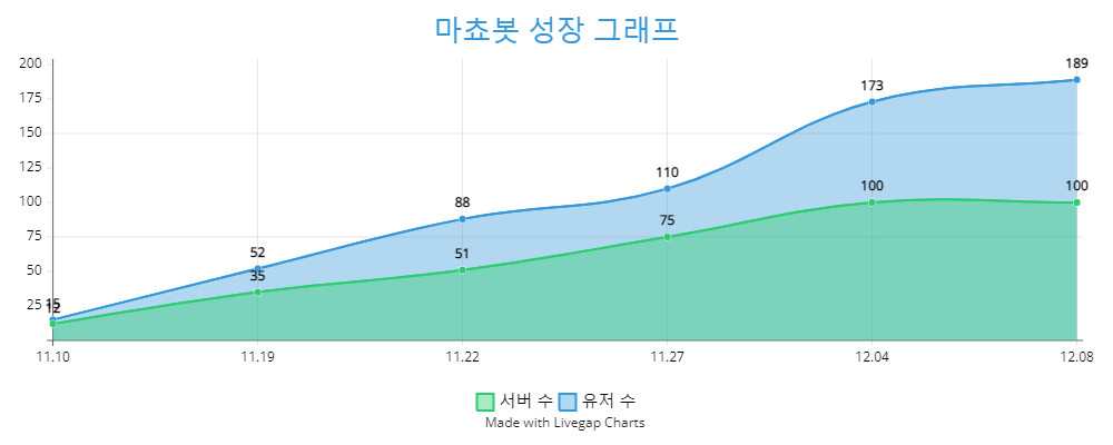 오늘(2021.12.12) 기준으로 201명의 유저를 확보했고, 100개의 서버에 초대되었다.